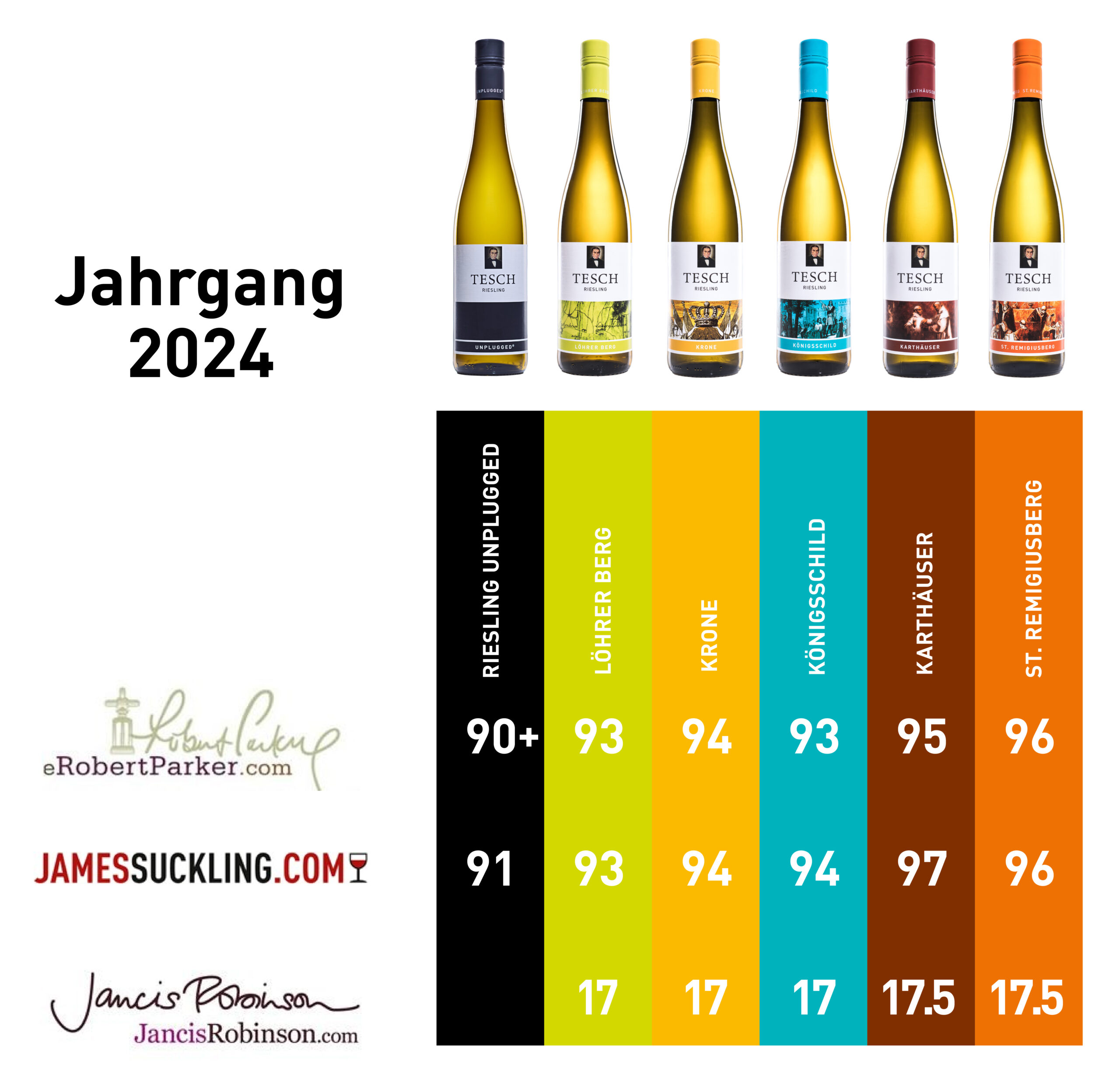 „This youthful dry riesling has a joyful lemon character, but also complex garden herb aromas. A compact structure is married to a medium body and crisp, stony acidity. Still quite tightly wound for a site that tends to give wines that open quite early. Excellent tension in the very long, lemony finish. Drink from release. “ 94 | S. Pigott | www.jamessuckling.com„Tesch’s 2024 Krone Laubenheim Riesling Trocken offers an intense and elegant, super aromatic nose with ripe and juicy stone fruit aromas mixed with finely flinty notes of crushed stones. Filigreed and enormously saline on the palate, this is a medium- to full-bodied, very elegant, savory but also intense and juicy Riesling with yellow plums and apricot notes. This highly stimulating and aromatic dry Riesling is reminiscent of a Wachau Riesling Smaragd from the 1990s. 12.5% stated alcohol. Screw-cap closure. Tasted in July 2025.“ 94 | S. Reinhardt | www.robertparker.com