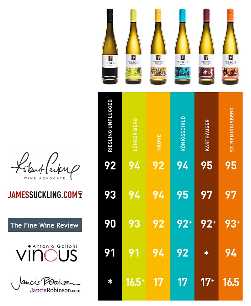„Der Königsschild wächst auf Kalkboden, was ihm immer einen feinen Schmelz mitgibt. Die Frucht bewegt sich im Steinobst-Spektrum, wird aber trotz der mineralischen Schubkraft niemals wuchtig. Er ist vielleicht ein Ticken cremiger als der Remigiusberg oder der Karthäuser, was ihm einen unvergleichlichen Charme gibt. Mundwässernd, salzig und klirrend klar, wie immer bei Tesch, ist er dennoch. Genialer Stoff von der unteren Nahe, der mit seinem Kalkstein-Charakter ein kleiner Wink mit dem Zaunpfahl in Richtung Rheinhessen ist.“