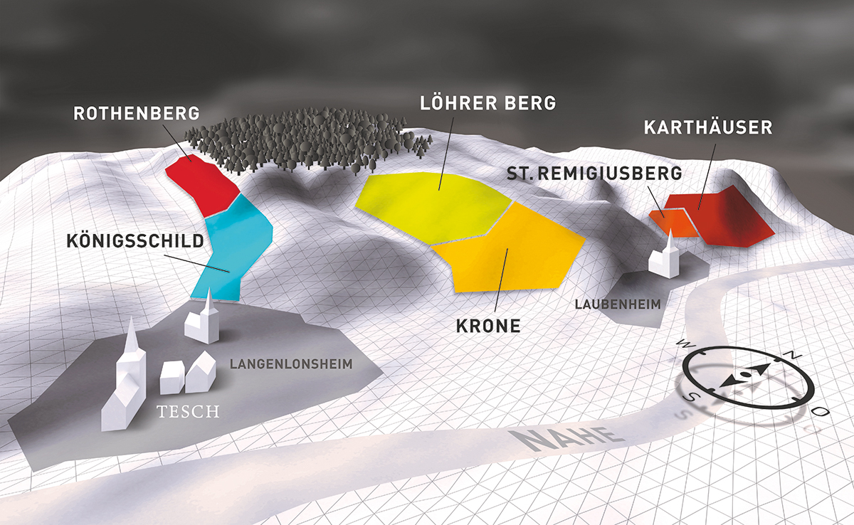 “Die Krone, die Nachbarlage des Löhrer Bergs, wächst auf einem Bodengemisch aus Lösslehm und verwittertem Sandstein. Die Laubenheimer Krone ist dem Westwind ausgesetzt. In der Nase zeigt sie eine Vielzahl an Früchten. Am Gaumen zeigt sich der Wein ausgesprochen opulent und pfirsichbetont, endet jedoch trocken und würzig. Ein Wein der sich hervorragend mit vielen Speisen kombinieren lässt. Langanhaltend.”